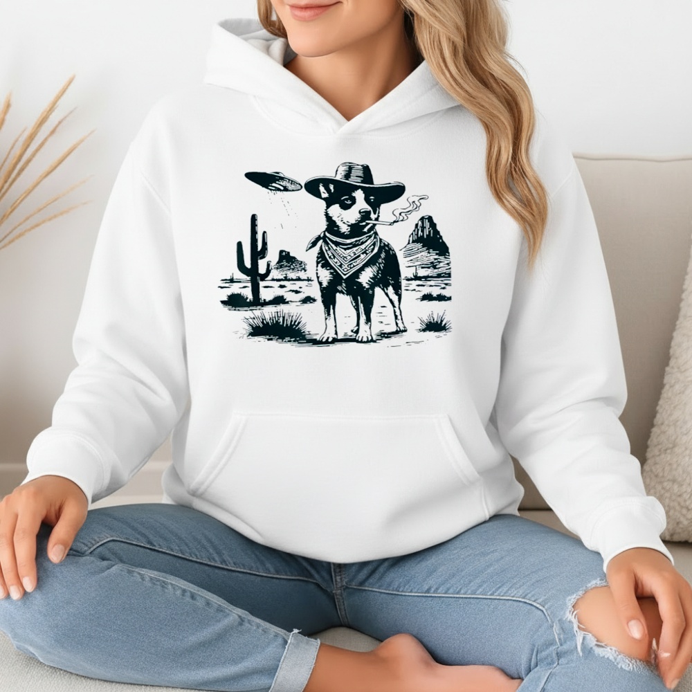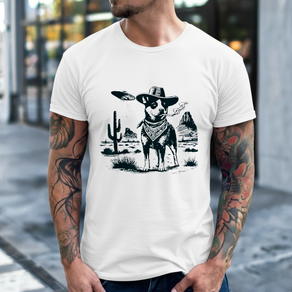 Out on the range, things can get strange, but this Blue Heeler has seen it all. This shirt captures a scene straight out of a fever dream: an Australian Cattle Dog, donned in a cowboy hat and bandana, taking a casual smoke break while a flying saucer beams down in the background. It is a masterpiece of the “hard image” aesthetic—tough, cool, and completely absurd.