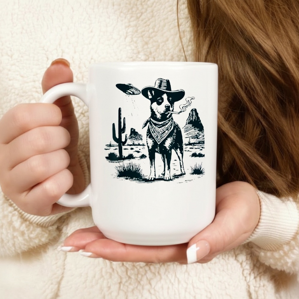 What breed of dog is on the shirt? The illustration features an Australian Cattle Dog, also known as a Blue Heeler or Red Heeler. They are famous for their intelligence and toughness, fitting the “cowboy” theme perfectly.