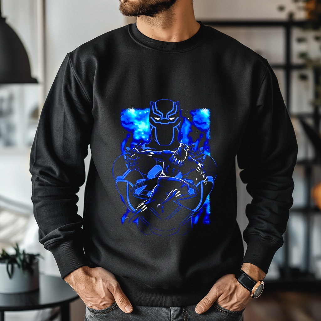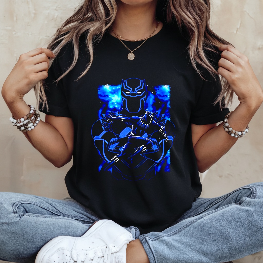 In the heart of the jungle or the concrete canyons of the city, the Black Panther is often felt before he is seen. The Black Panther “King Panther” Shadow Silhouette Superhero Shirt captures this essence of stealth and power. Instead of a bright, splashy cartoon, this design utilizes the drama of shadow and light. It focuses on the sleek outline of the Panther habit—the ears, the cowl, the claws—emerging from the darkness. It is a tribute to T’Challa not just as an Avenger, but as a King who operates with the silent precision of a predator. It’s a sophisticated, “powerful” graphic that commands respect without saying a word.