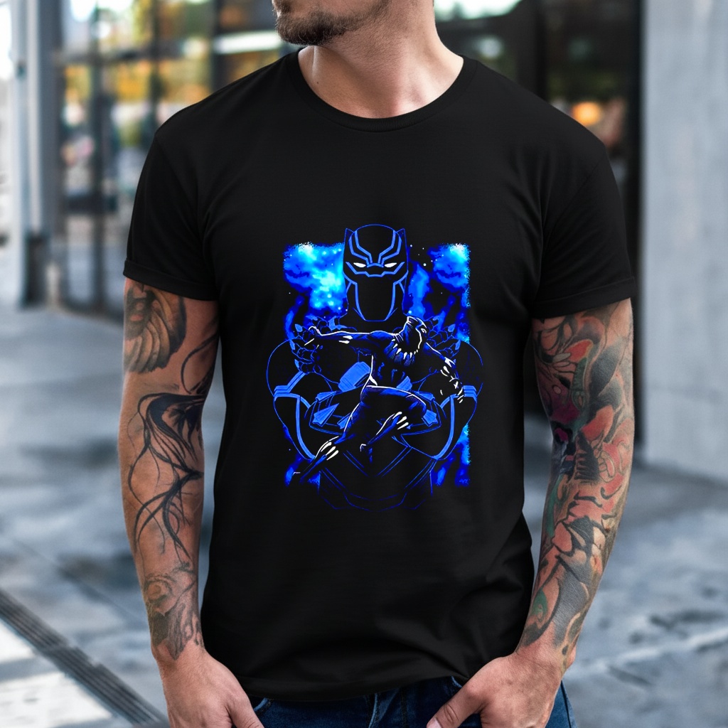 Is this from the movie or the comic? The Black Panther shadow shirt features an artistic, “superhero-inspired” silhouette that pays tribute to the character’s look across both comics and film.