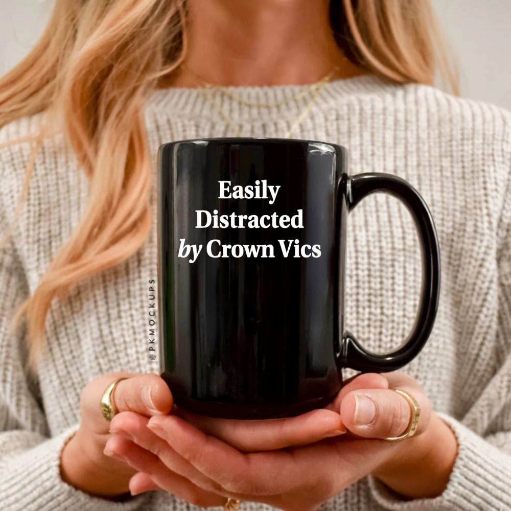 Long Live the Queen (of the Road) This design celebrates the Ford Crown Victoria’s legendary status as the last true American sedan—body-on-frame, V8 engine, rear-wheel drive, and built like a tank. The slogan “Easily Distracted by Crown Vics” is a humorous nod to the fact that while others are looking at Lamborghinis, you are checking out the push bar and spotlight on a 2008 Interceptor. It’s a niche joke for a community that values durability, reliability, and the ability to jump a curb at 40 mph without spilling your coffee.