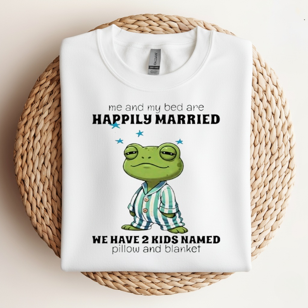 Frog me and my bed are happily married we have 2 kids named pillow and blanket shirt
