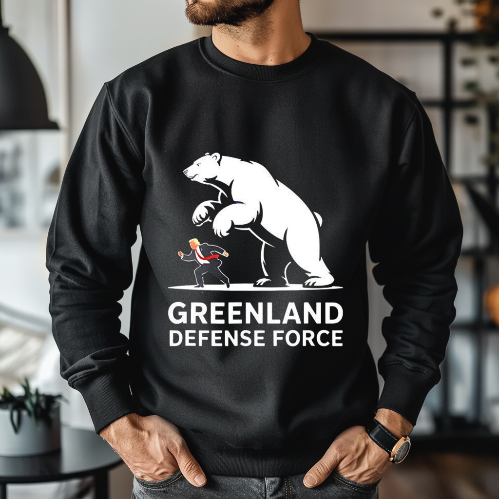 The 51st state that never was. This satirical tee features the fictional “Greenland Defense Force” insignia, showcasing a bold caricature of Donald Trump and a polar bear ready to defend the glaciers.
