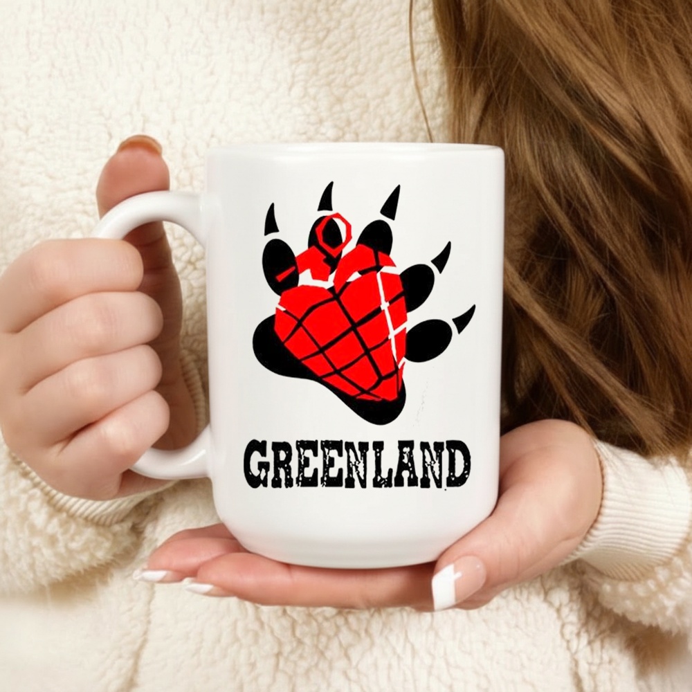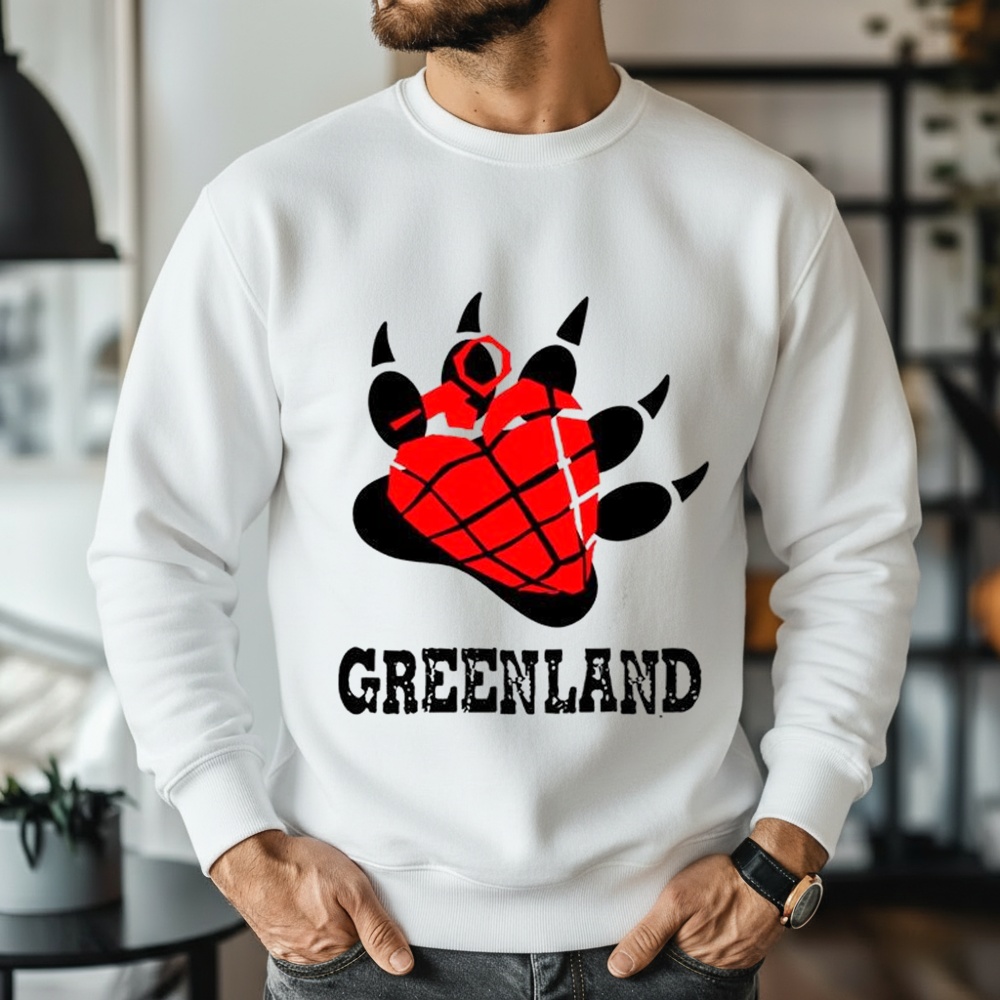 What does the bear paw represent? The polar bear (Nanook) is the national symbol of Greenland, appearing on its coat of arms. In this design, it replaces or modifies the standard “heart grenade” to theme the shirt around Greenland.