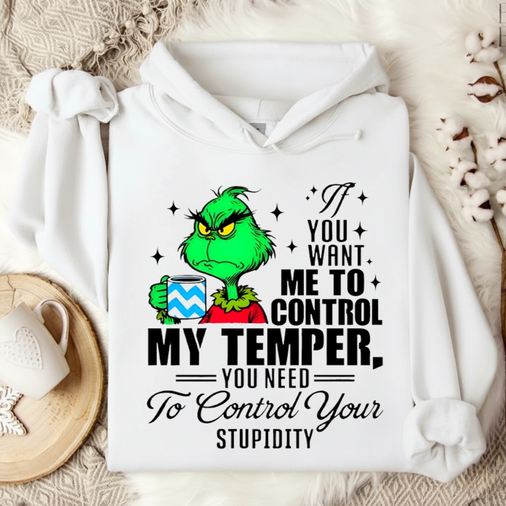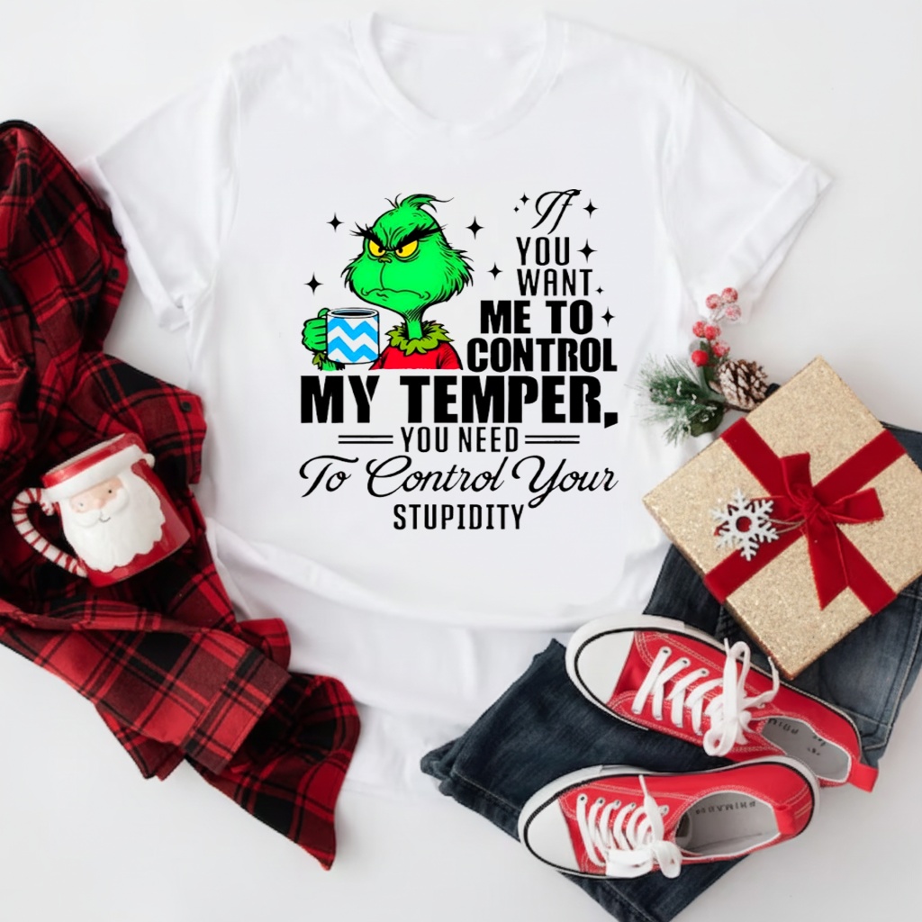 Description for Grinch you want me to control my temper you need to control your stupidity shirt