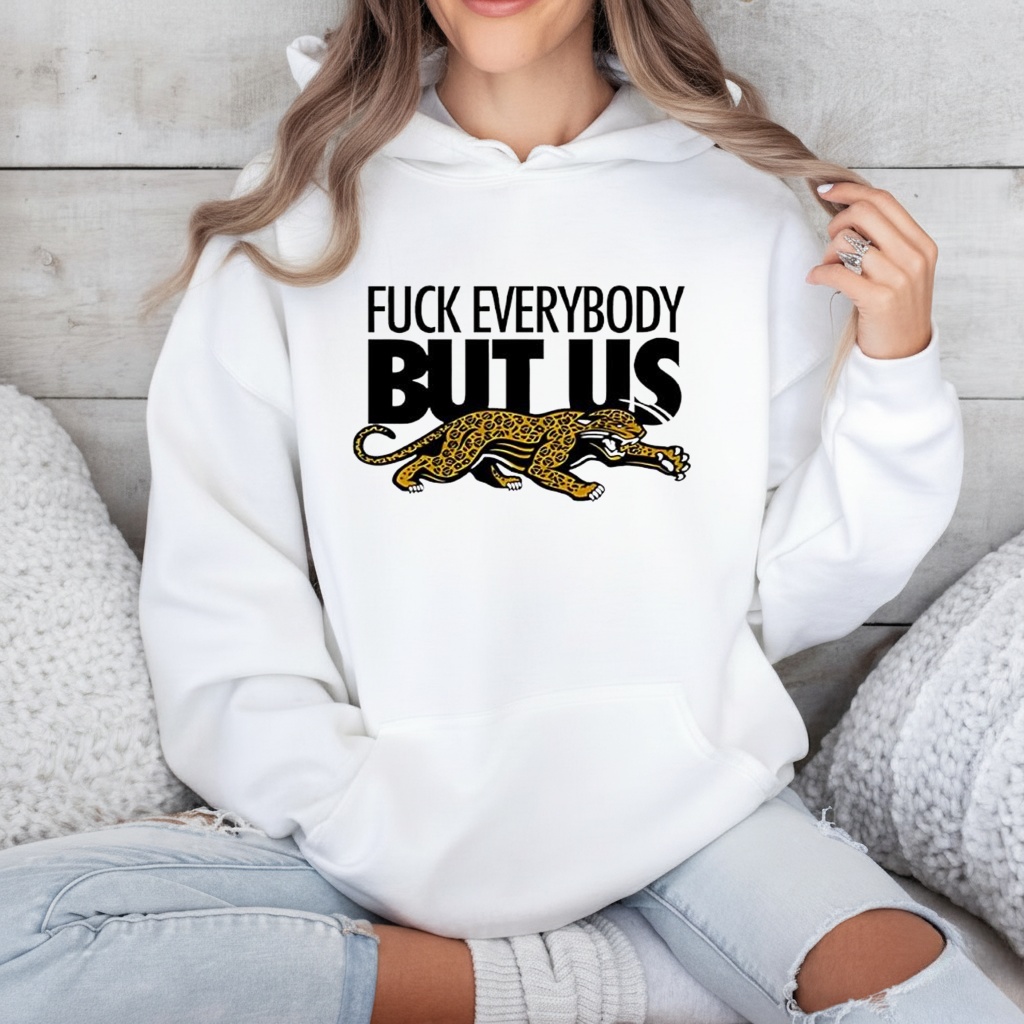 A1: The shirt emphasizes fierce loyalty to the Jacksonville Jaguars with the bold “Fuck Everybody But Us” slogan, highlighting the fan mentality of unwavering support and playful rivalry.