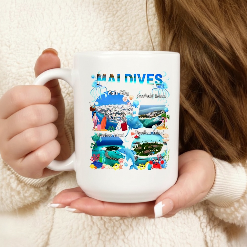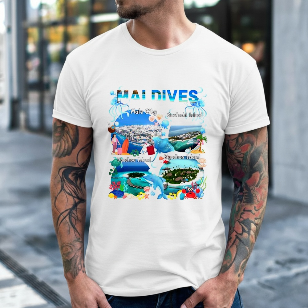 From the glowing shores of Vaadhoo to the vibrant streets of Male City, this design captures the diverse beauty of the Indian Ocean. It features a breathtaking photo collage of the Maldives’ most iconic islands, making it the perfect wearable postcard for your next tropical getaway.