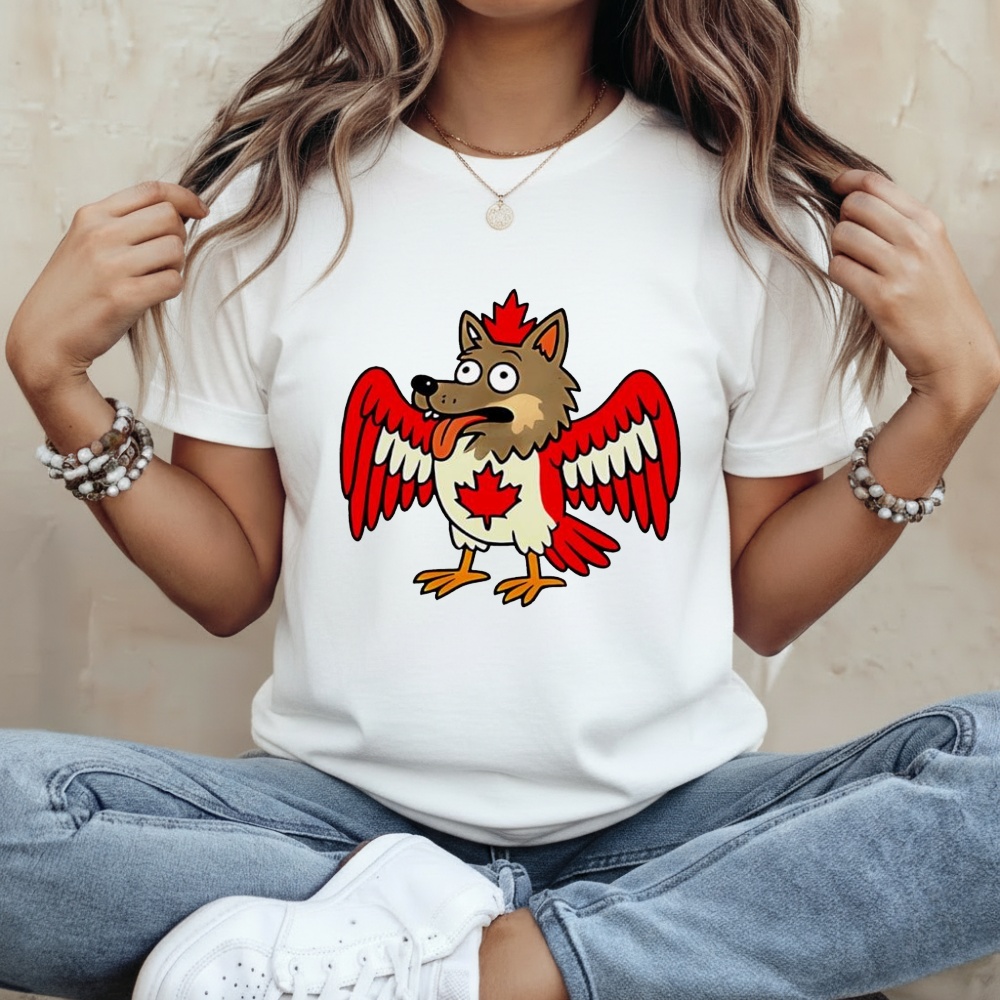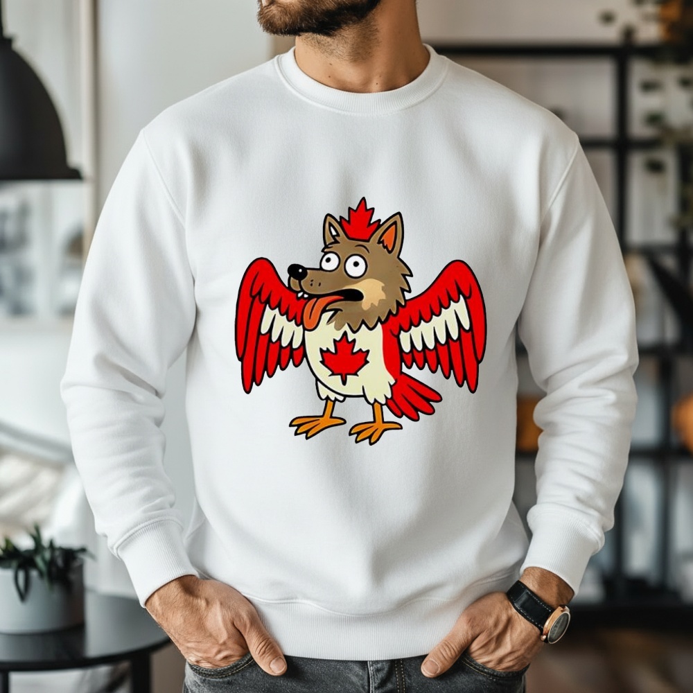 Meet the most confusing animal in the Great White North. This design features a hilarious hybrid creature—part wolf, part bird, and entirely obsessed with maple—making it the ultimate tribute to Canadian eccentricity.