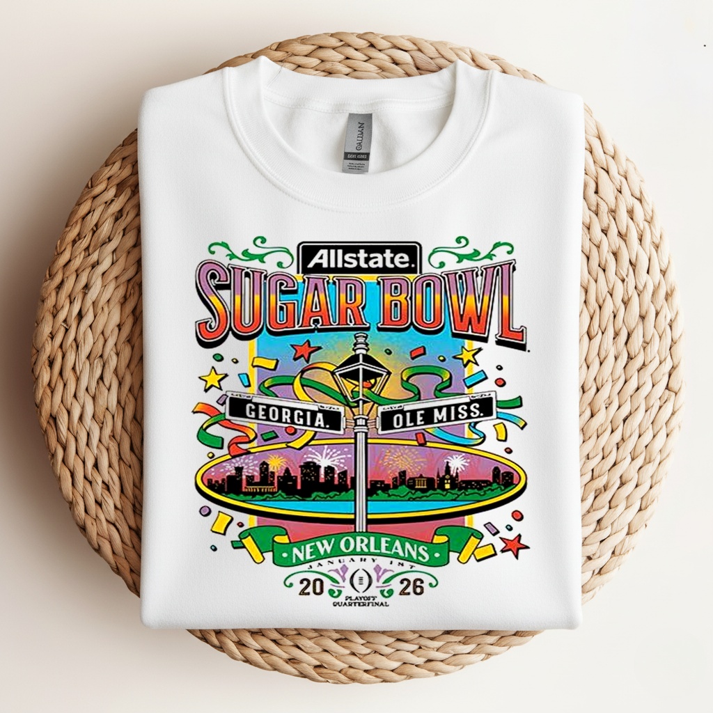 The Ole Miss Rebels vs Georgia Bulldogs NCAA 2026 Allstate Sugar Bowl New Orleans Shirt highlights one of college football’s most anticipated matchups. Featuring a graphic commemorating the Sugar Bowl showdown, this shirt allows fans of both teams to show pride and excitement for the game. Its design captures the competitive spirit and rivalry between Ole Miss and Georgia, making it a standout choice for tailgates, game-day gatherings, or casual outings during the 2026 bowl season.