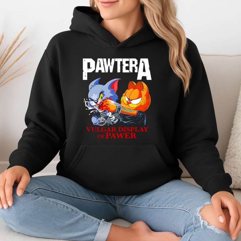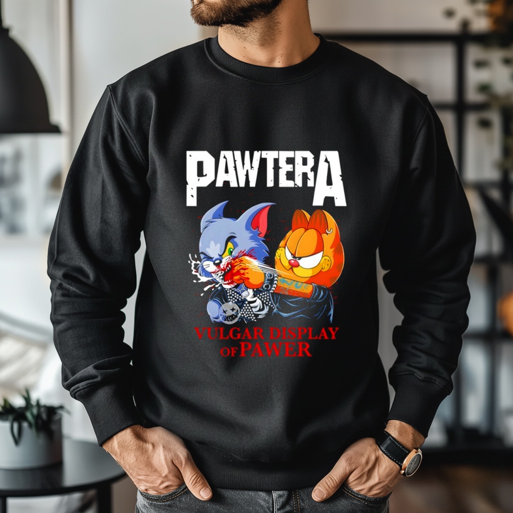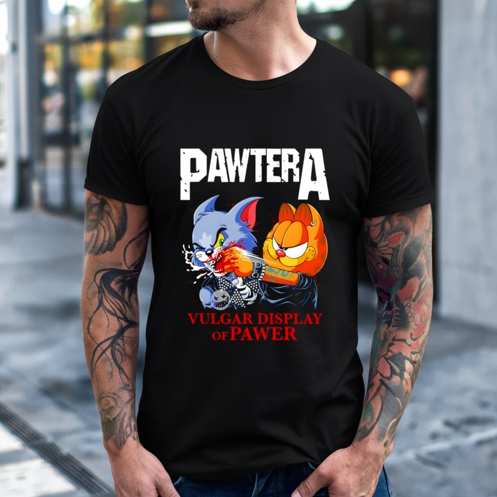 What band is this shirt parodying? This Pawtera parody shirt is a humorous spoof of the legendary American heavy metal band Pantera, specifically referencing their 1992 album Vulgar Display of Power.