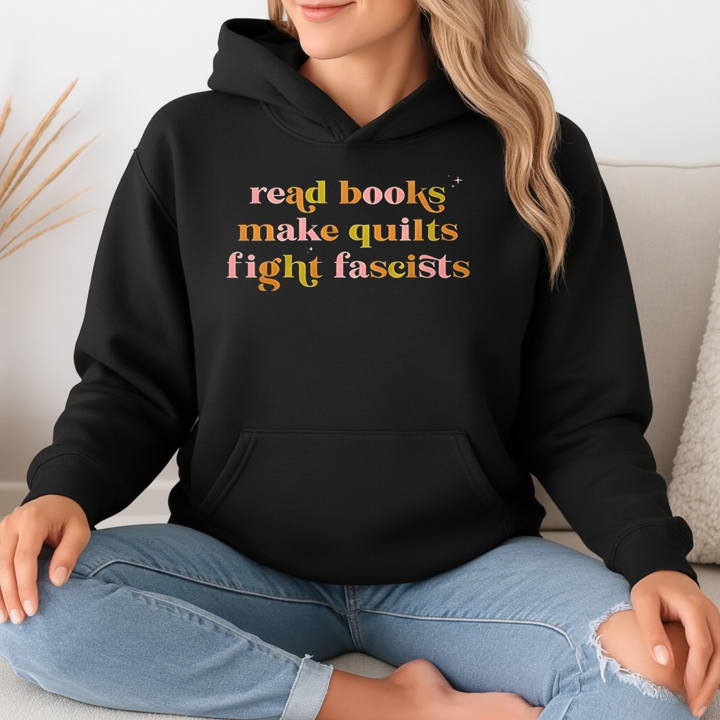 The revolution includes a reading list and a sewing kit. This empowering tee features the slogan “Read Books, Make Quilts, Fight Fascists,” celebrating the intersection of intellectual growth, creative expression, and political resistance.
